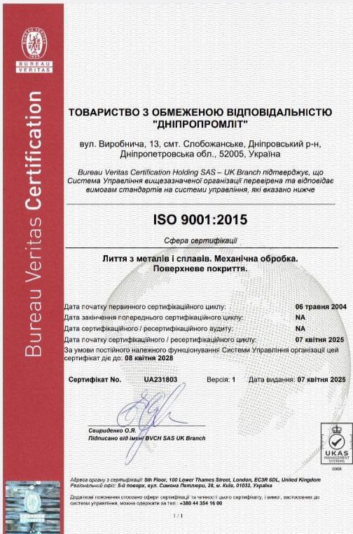 Критерій оцінки успішності підприємства ливарної галузі – наявність сертифікованих стандартів якості на виробництві та ліцензійних висновків щодо продукції, що виробляється. Компанія ТОВ «Дніпропромліт» – ливарне виробництво європейського рівня, що має повний спектр дозвільної документації для проведення профільних робіт з формування, лиття, виробництва ливарного оснащення та механічної обробки виробів. В арсеналі компанії підтверджена вищими європейськими органами сертифікації система управління якістю (система стандартів ISO9001), ліцензія на функціонування виробничої лабораторії, оснащеної відповідно до вимог сучасного ливарного виробництва. Підприємство також є утримувачем унікального умовного номера заводу-виробника для виробництва лиття широкого спектра номенклатури залізничної продукції. Практично всі деталі, вироблені для залізниці, пройшли додаткову сертифікацію і мають сертифікати відповідності міждержавного зразка. Таким чином, висока якість та сучасні стандарти роботи компанії ТОВ «Дніпропромліт» підтверджуються як документально, так і конкретними виробничими результатами.